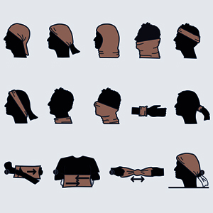 - [روشهای پوشیدن چندگانه] را میتوان بهعنوان کلاههای باز یا بسته، ماسک صورت، گتر گردن، روسری، باندانا، آستر کلاه ایمنی، هدبند و حتی مچبند استفاده کرد.
